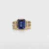 18K yellow gold ring with two emerald cut side diamonds weighing approximately 0.50 carat total. In the center, one tanzanite measuring approximately 10x8 mm